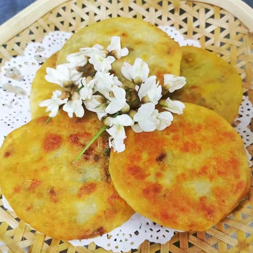 昨天 恰巧看到有人拿竹竿打下了好多槐花,我統(tǒng)統(tǒng)買了回來(lái),足有8斤多!回來(lái)后請(qǐng)廚師用清水洗凈,用鹽水浸泡,揉面焯水,裹調(diào)拍打成形,兩面煎烤,一塊塊槐花餅受熱膨脹,香氣四溢!不由得垂涎滴襟腸肚慌,眾人爭(zhēng)相把餅嘗。咬一口松軟彈牙,嚼著嚼著清香可口,唇齒間留住了春天的味道,妙不可言!淡淡的槐花和雞蛋的香味,讓你的味蕾綻放開(kāi)來(lái),那種焦、香、酥、脆的感覺(jué)會(huì)讓你久久不能忘懷!嚼著嚼著,眼前浮現(xiàn)童年時(shí)的光景,小河脈脈,蛙聲四起。也許這種悠長(zhǎng)的懷念,就是鄉(xiāng)愁!
