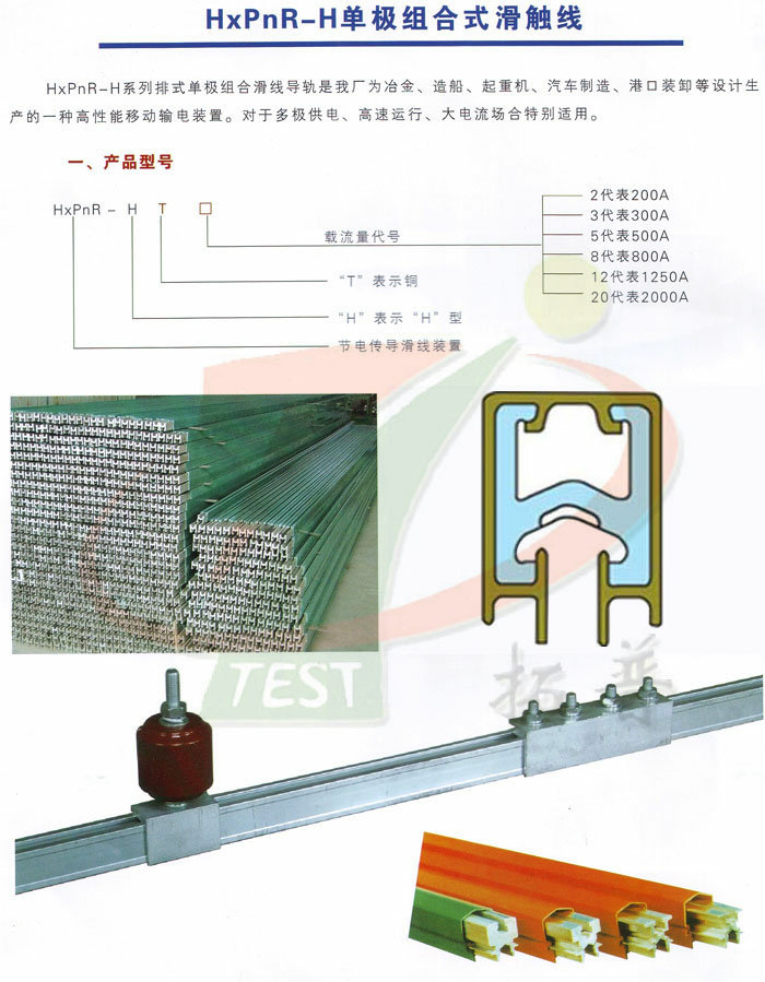 HXPnR- H系列單極組合式滑觸線由H型鋁合金本體導(dǎo)軌加壓V型不銹鋼滑接帶、PVC絕緣外殼、外置式集電器以及懸吊、固定等組件組合而成。該產(chǎn)品以其設(shè)計(jì)新穎、結(jié)構(gòu)合理、維護(hù)方便、使用安全等特點(diǎn)被廣泛應(yīng)用于電流較大、使用頻率較高、運(yùn)行速度快和環(huán)境較差的場合。