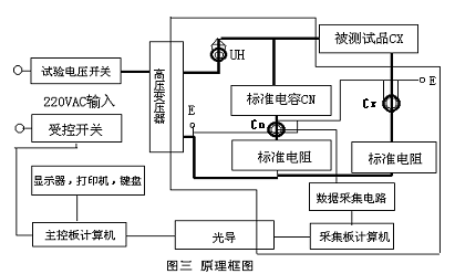 TPJSC系列智能化抗干擾介質(zhì)損耗測(cè)試儀測(cè)量線路包括一路標(biāo)準(zhǔn)回路和一路測(cè)試回路,如圖三所示。標(biāo)準(zhǔn)回路由內(nèi)置高壓穩(wěn)定度標(biāo)準(zhǔn)電容器與標(biāo)準(zhǔn)電阻網(wǎng)絡(luò)組成,由計(jì)算機(jī)實(shí)時(shí)采集標(biāo)準(zhǔn)回路電流與測(cè)試回路的電流幅值及其相位差,并算出被測(cè)試品電容容值(CX)和介質(zhì)損耗(tgδ)。