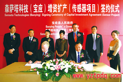 1月19日中午,美國森薩塔科技公司在揚州與我縣簽訂增資擴產(chǎn)協(xié)議,市委書記、市人大常委會主任王燕文,市委副書記、市長謝正義,副市長聞道才,森薩塔科技總裁兼首席運營官瑪莎·蘇利文女士,森薩塔科技執(zhí)行副總裁、首席財務官杰夫·科特先生,森薩塔科技運營高級副總裁迪克·丁先生,縣委書記、縣人大常委會主任仲生,縣委副書記、縣長王庭國,縣委副書記周玉寶,副縣長顧長榮以及市經(jīng)信委、商務局、質(zhì)監(jiān)局、海關(guān)、商檢局和我縣相關(guān)負責人等出席簽約儀式。