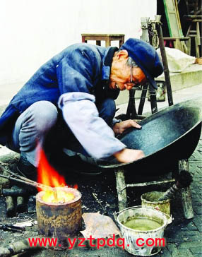 補鍋匠左手拉著風箱,右手提過鍋,放在鋪有草木灰的地上,www.hrtdj.com.cn用一只小巧玲瓏的鐵錘,在要補的四周輕輕地敲打。