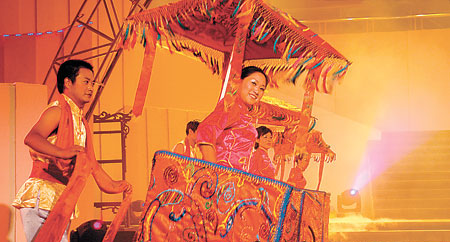 流傳于高郵市車邏鄉(xiāng)一帶,距今約有在百多年歷史,是民間婚嫁迎娶習(xí)俗中表演的一種舞蹈。表演者人數(shù)可多可少,但不得少于8人。由4人扮轎夫,共抬1頂花轎;其余人員手拿各種樂器,既是舞蹈的表演者,又為吹鼓手?;ㄞI出門,途中以及把新娘迎娶到家,全過程不停地吹奏表演。主要舞步為跳踮卡、園場(chǎng)步等;隊(duì)形為串8字形、分8字形、絞麻花等。氣氛歡快熱烈。