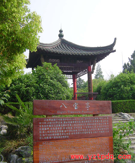 至明朝得寶河淤塞,真如寺傾頹。嘉靖三十年(1551)縣令岳東升見(jiàn)其地云氣殊常,五彩繽紛,命浚得寶河,作記刻碑,建亭護(hù)之,名“八寶亭“。此亭位于縣南街,清代曾兩次重修。1982年,年久失修的八寶亭被拆除,遷建于縱棹園中,趙樸初題額。八寶亭象征著寶應(yīng)得名的由來(lái),朝暉夕陽(yáng)映其雄姿,風(fēng)花雪月寄其詩(shī)情,它總是令人想起真如獻(xiàn)寶大唐轉(zhuǎn)危為安的神奇故事,已經(jīng)成為寶應(yīng)的標(biāo)志性建筑,令中外游客駐足瞻仰浮想聯(lián)翩。