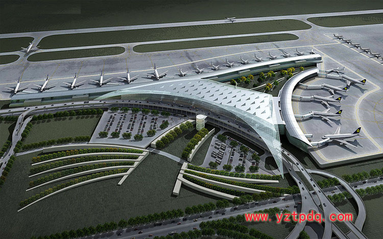 在機場航站樓效果圖上,作者發(fā)現(xiàn)航站樓平面形狀為扇形,地上二層,屋面為雙螺旋曲面構造體系。據(jù)介紹,機場航站樓由美國蘭德隆與布朗有限公司設計,建筑造型新穎,采用鋼結構屋面,為斜交網格結構,具有三維動感立體視覺效果。在機場航站樓前,是一個半月形的人工湖。“月光下的一彎‘藍月’,像一面明鏡特別迷人,體現(xiàn)出‘天下三分明月夜,二分無賴是揚州’的月亮文化特色。”施工人員介紹說。