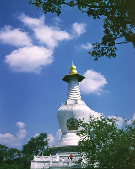 揚(yáng)州的白塔高 27.5 米 ,下面是束腰須彌塔座,八面四角,每面三龕,龕內(nèi)雕刻著十二生肖像。和北海白塔的厚重穩(wěn)健不同,揚(yáng)州白塔比例勻稱(chēng),玉立亭亭。和身邊的五亭橋相映成趣。