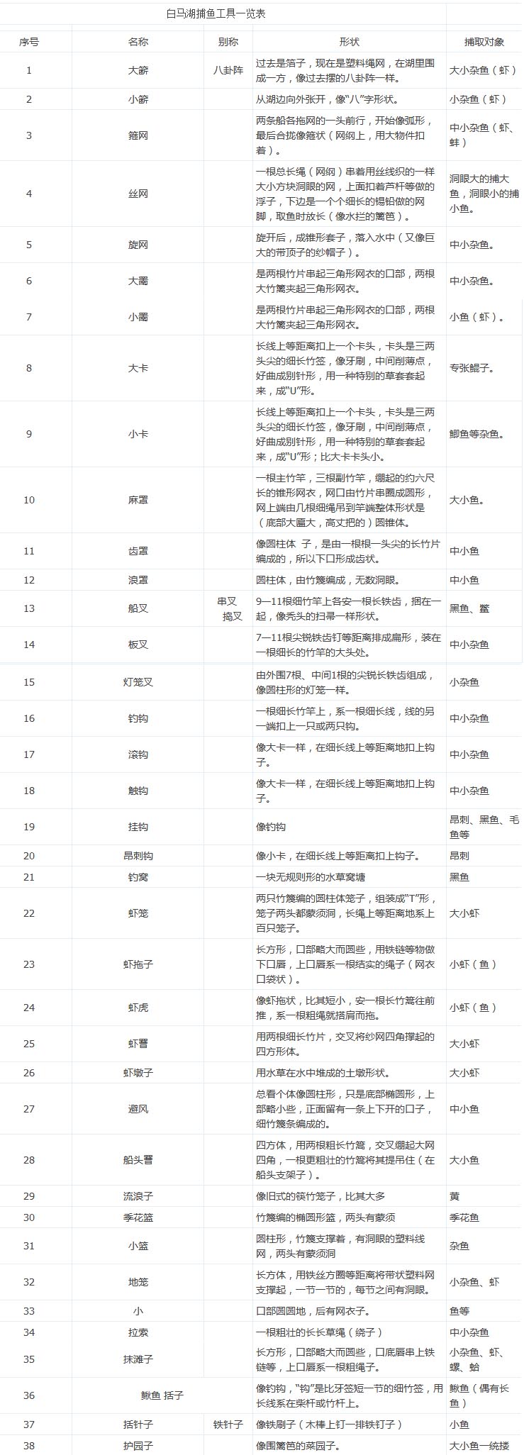 白馬湖區(qū)漁民捕魚(yú)工具一覽表