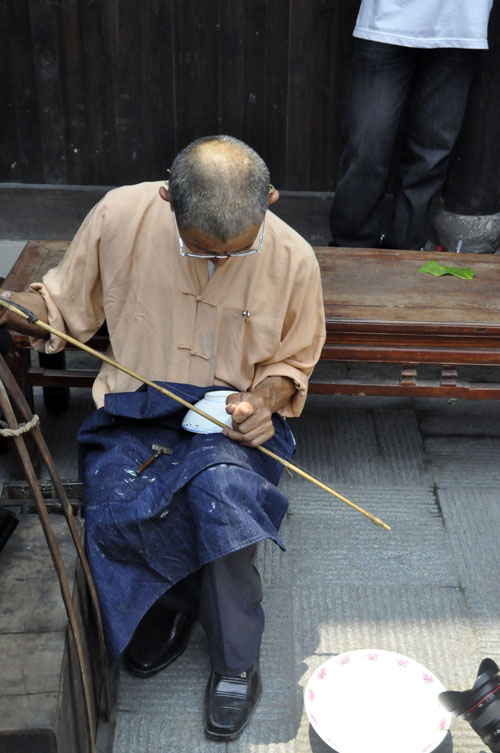 日常使用陶瓷器很普及,因此各地都能看到補(bǔ)碗匠,他們一般沒有固定的攤位,挑一副簡(jiǎn)易擔(dān)子,內(nèi)存必要的工具和材料,走街穿巷攬生意做,從那“補(bǔ)碗哦,補(bǔ)碗哦……”吆喝的長腔中,你能發(fā)覺他們不是本地人。操此營生的,以江西老表居多,景德鎮(zhèn)是我國著名的瓷都,產(chǎn)量豐富,由此衍生出“補(bǔ)碗”行業(yè)也是很自然的事情。有一句歇后語:江西人補(bǔ)碗——自顧自,即是從補(bǔ)碗鉆孔時(shí)發(fā)出的“口茲口茲”有節(jié)奏的聲響引發(fā)的,它似乎沒有譏諷老表的意思,而是抨擊自私自利的行為。隨著補(bǔ)碗行當(dāng)?shù)南觯@句歇后語也已淡出江湖。補(bǔ)碗匠大多身懷絕技,小到酒杯,大到幾個(gè)人合抱不過來的醬缸,他們都有本領(lǐng)使之“完璧”。有些人家,祖?zhèn)鞯恼滟F瓷器有了裂紋,未雨綢繆,預(yù)先給“補(bǔ)”起來;而尋常人家,生活節(jié)儉,只要“補(bǔ)”比買新的便宜,一只破碗他們都不舍得丟棄,湊合著補(bǔ)一補(bǔ)再用。當(dāng)然,如今可不這樣了,瓷器磕破了,一扔了之,誰也不會(huì)想到去“補(bǔ)”。