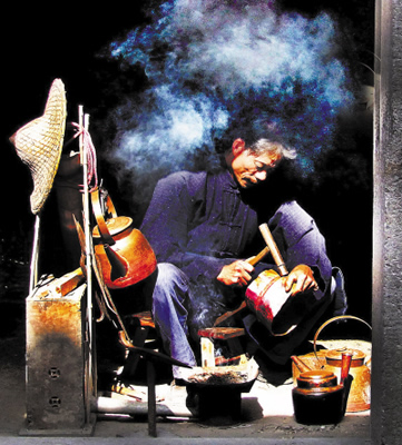 老揚州人家都喜歡銅器,那時候,一般家庭所使用的器皿都離不開銅器,婚嫁時必備兩個銅盆,子孫滿月又要送個銅盆、一雙銅筷子,父母過六十大壽,子女照例會送上一個銅盆,寓意父母金盆洗手可以享清福了。以前揚州一帶人家以擁有銅器為榮,使用銅器多的便是大戶人家。但到了“大躍進”大煉鋼鐵時,人們紛紛把銅器捐了出來,銅器從此在日常生活中“淡出”,銅器鋪相繼關(guān)門,可銅匠擔仍然活躍在街頭巷尾。