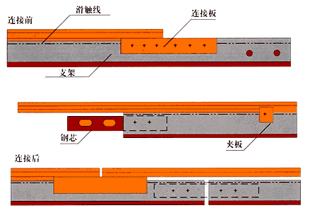 滑觸線的安裝支架一般為3m一個(gè),特殊情況亦可采取加強(qiáng)措施適當(dāng)擴(kuò)大距離,三根滑觸線之間的相間距離為400mm,如為低阻抗滑觸線,相間距離可擴(kuò)大到450mm。
